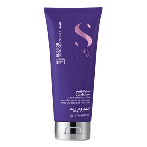 Odżywka Alfaparf Semi di Lino Anti-Yellow Conditioner bogata jest w Violet Ash .21, czyli pigment fioletowoniebieski, który jest doskonały do niwelowania żółtych refleksów. Dodatkowo specjalny składnik aktywny Blonde Recovery, pozyskiwany z nasion chleba świętojańskiego, dodaje energii i nawilża włókna włosów. Struktura makromolekularna odżywki chroni włókna włosów przed zanieczyszczeniami i metalami ciężkimi dzięki stworzeniu warstwy ochronnej. Kosmetyk zawiera kompleks stopniowo uwalniający substancję czynną, zapewniającą wyjątkowo długotrwały połysk. Odżywka rewitalizuje i nawilża włosy, nie obciążając ich. Pozostawia blond pasma rozświetlone, błyszczące i miękkie w dotyku. Odżywka jest idealne do częstego stosowania.