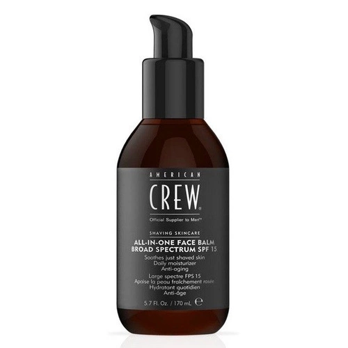Balsam po goleniu American Crew All-In-One Face Balm Broad Spectrum SPF15 posiada w składzie kojący i nawilżający pantenol, regenerującą alantoinę, nawilżający wyciąg z glonów oraz enzym Bacillus Ferment o działaniu delikatnie złuszczającym. Te komponenty pielęgnują skórę, działają ochronnie, nawilżająco i przeciwstarzeniowo.
