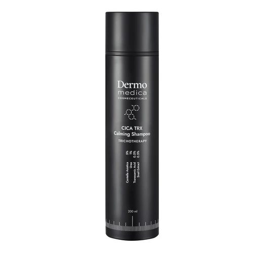Dermomedica CICA TRX Calming Shampoo to specjalistyczny szampon trychologiczny, który powstał z myślą o najbardziej wymagającej, wrażliwej i podrażnionej skórze głowy. Jego wyjątkowa, delikatna formuła skutecznie oczyszcza włosy i skórę, nie naruszając naturalnej bariery ochronnej, dzięki czemu zapewnia uczucie komfortu już po pierwszym użyciu. Zawarte w nim składniki aktywne, działają kojąco, łagodzą zaczerwienienia oraz zmniejszają uczucie swędzenia i dyskomfortu, przywracając równowagę skórze głowy.